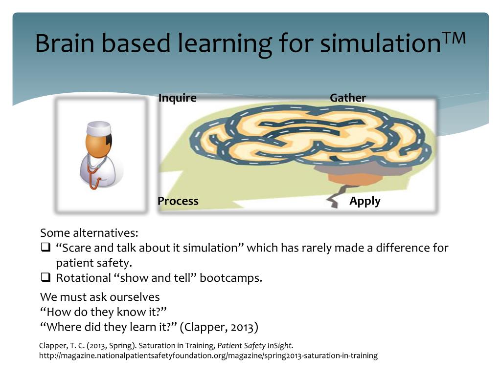 Brain based learning for simulationTM Inquire Gather Apply Process • Some alternatives: • “Scare and talk about it simulation” which has rarely made a difference for patient safety. • Rotational “show and tell” bootcamps. • We must ask ourselves • “How do they know it?” • “Where did they learn it?” (Clapper, 2013) Clapper, T. C. (2013, Spring). Saturation in Training, Patient Safety InSight. http://magazine.nationalpatientsafetyfoundation.org/magazine/spring2013-saturation-in-training