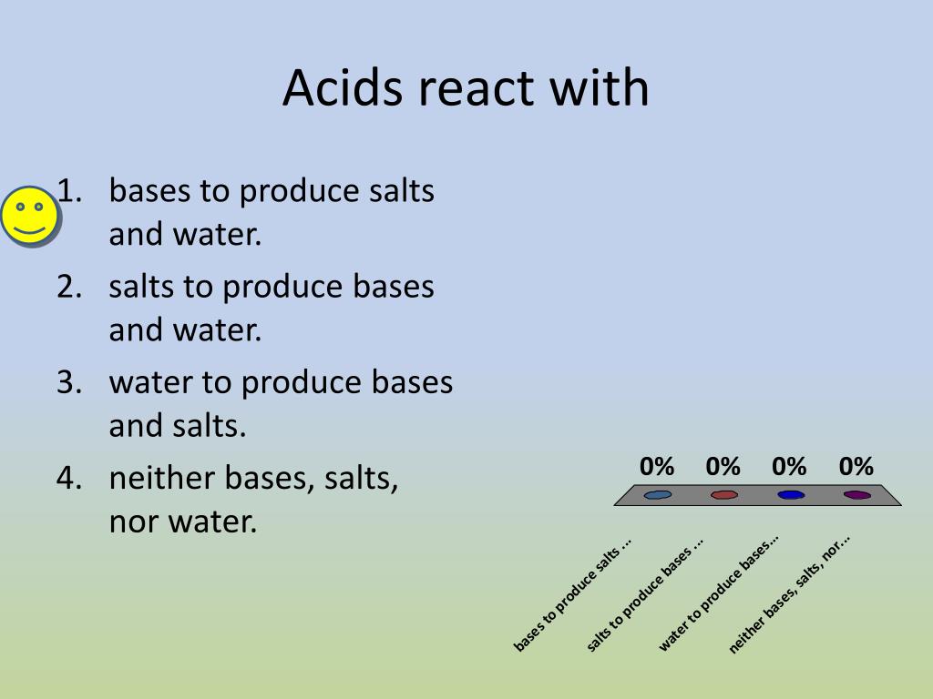 Acids react with • bases to produce salts and water. • salts to produce bases and water. • water to produce bases and salts. • neither bases, salts, nor water.