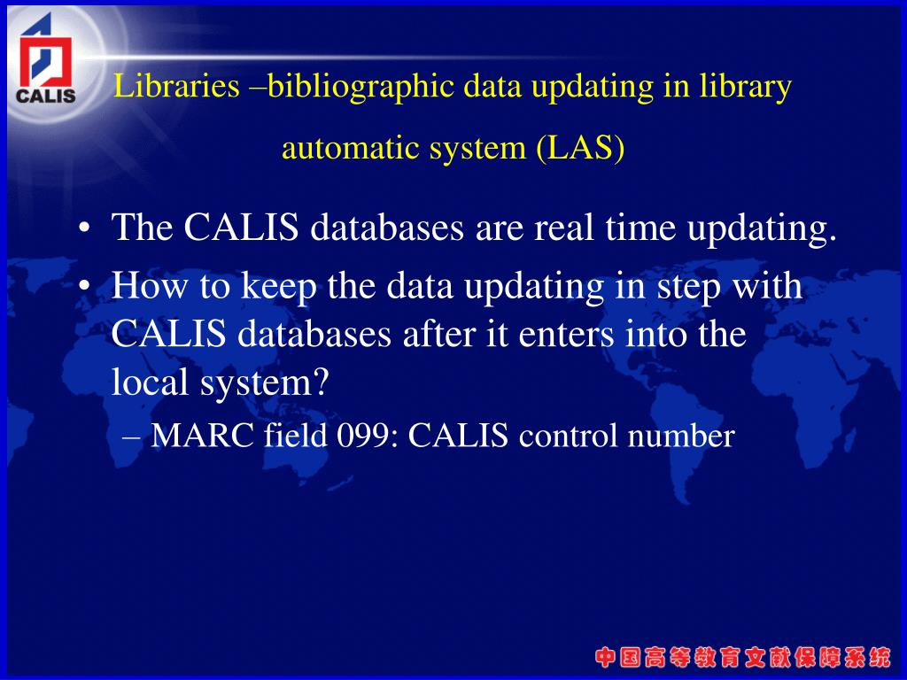 Libraries –bibliographic data updating in library automatic system (LAS) • The CALIS databases are real time updating. • How to keep the data updating in step with CALIS databases after it enters into the local system? • MARC field 099: CALIS control number