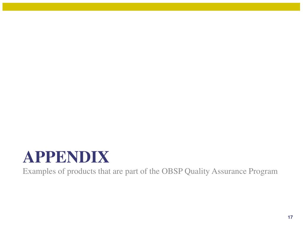 Examples of products that are part of the OBSP Quality Assurance Program Appendix