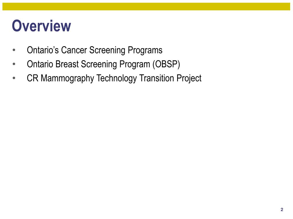 Overview • Ontario’s Cancer Screening Programs • Ontario Breast Screening Program (OBSP) • CR Mammography Technology Transition Project