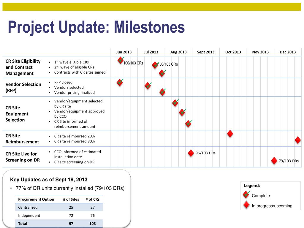 Project Update: Milestones 100/103 CRs 103/103 CRs • Key Updates as of Sept 18, 2013 • 77% of DR units currently installed (79/103 DRs) 96/103 DRs 79/103 DRs Legend: Complete In progress/upcoming