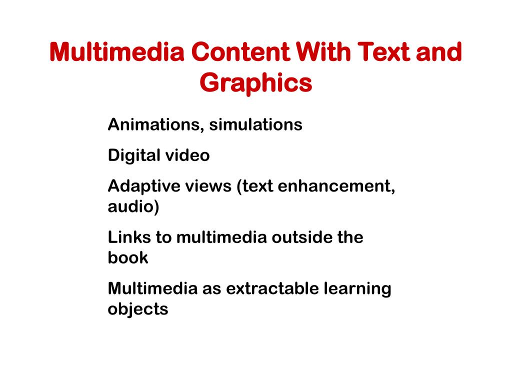 Multimedia Content With Text and Graphics Animations, simulations Digital video Adaptive views (text enhancement, audio) Links to multimedia outside the book Multimedia as extractable learning objects