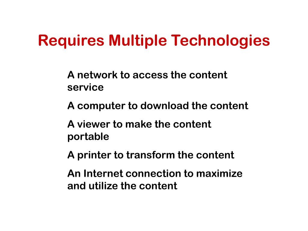 Requires Multiple Technologies A network to access the content service A computer to download the content A viewer to make the content portable A printer to transform the content An Internet connection to maximize and utilize the content
