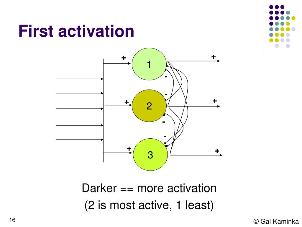 After a few more cycles • Once 1 is out of picture, only 2 and 3 compete • 2 becomes stronger: a weaker 3 inhibits 2 less 1 + + - - 2 + + - - 3 + +