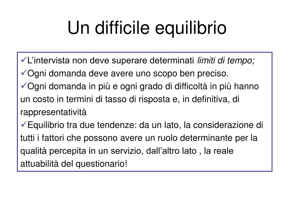 Un difficile equilibrio • L’intervista non deve superare determinati limiti di tempo; • Ogni domanda deve avere uno scopo ben preciso. • Ogni domanda in più e ogni grado di difficoltà in più hanno un costo in termini di tasso di risposta e, in definitiva, di rappresentatività • Equilibrio tra due tendenze: da un lato, la considerazione di tutti i fattori che possono avere un ruolo determinante per la qualità percepita in un servizio, dall’altro lato , la reale attuabilità del questionario!