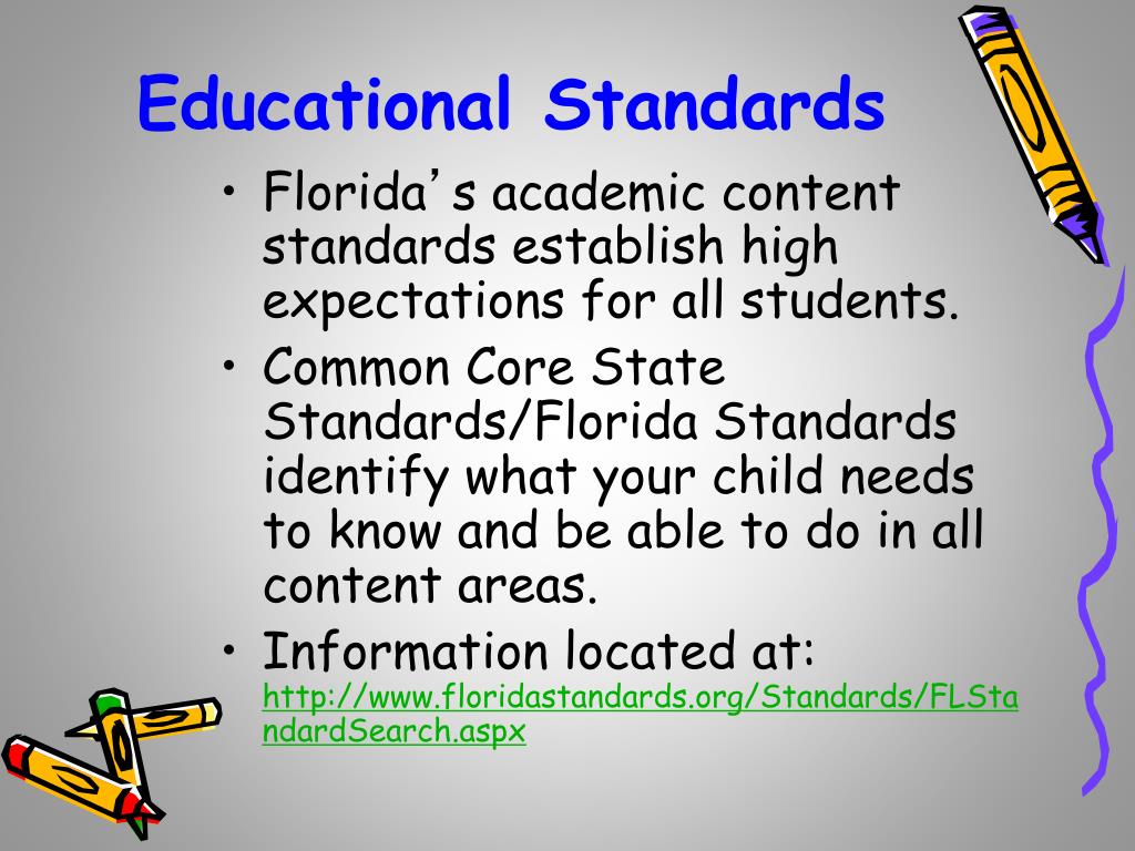 Educational Standards • Florida’s academic content standards establish high expectations for all students. • Common Core State Standards/Florida Standards identify what your child needs to know and be able to do in all content areas. • Information located at: http://www.floridastandards.org/Standards/FLStandardSearch.aspx