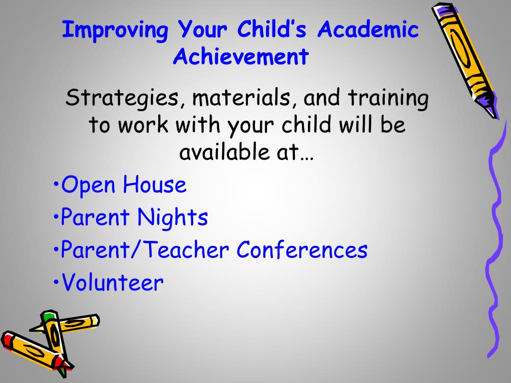 Improving Your Child’s Academic Achievement Strategies, materials, and training to work with your child will be available at… • Open House • Parent Nights • Parent/Teacher Conferences • Volunteer