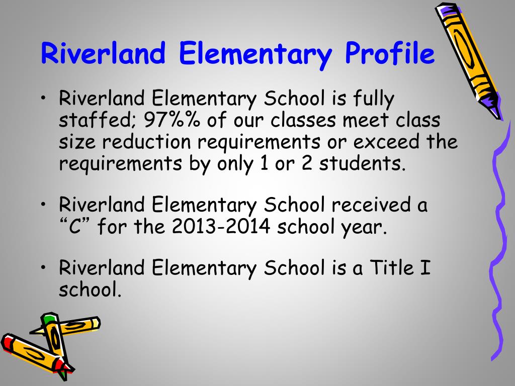 Riverland Elementary Profile • Riverland Elementary School is fully staffed; 97%% of our classes meet class size reduction requirements or exceed the requirements by only 1 or 2 students. • Riverland Elementary School received a “C” for the 2013-2014 school year. • Riverland Elementary School is a Title I school.