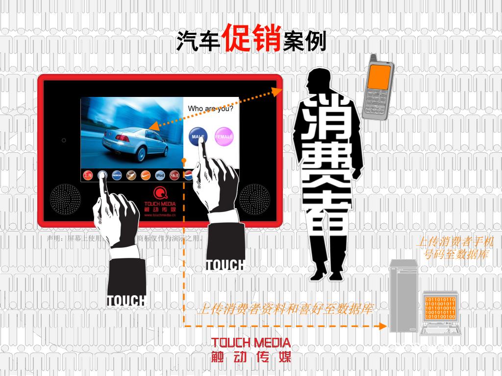 触动传媒的优势 • 流动媒体与因特网的经典结合 寓商于乐,无法抗拒! ---传播力 • 讲话、说故事、玩游戏 与消费者亲密无间! ---亲和力 • 喜欢你才看, 被动变主动 把选择权交给消费者!---精准投放 • 数据存析,与时俱进 广告战役大获全胜! ---投资回报