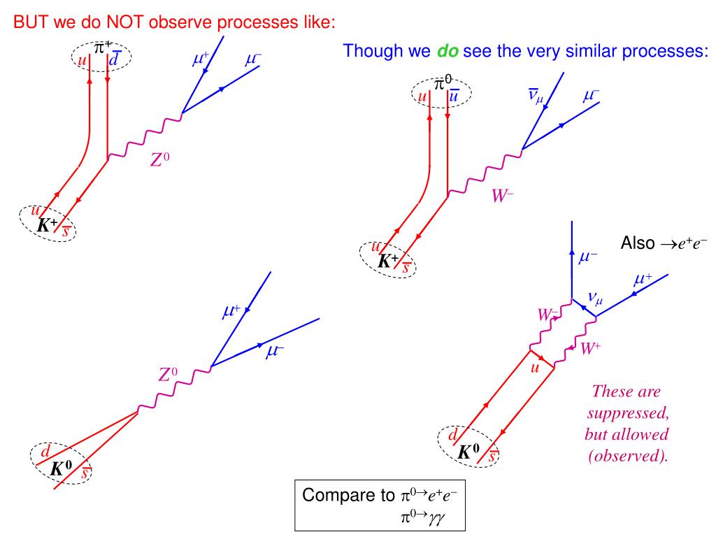 BUT we do NOT observe processes like: p+ Though we do see the very similar processes: m+m- u d p0 nmm- u u Z0 W- u s K+ Also e+e- u s m- K+ m+ nm m+ m- W- W+ u Z0 These are suppressed, but allowed (observed). d s d s K0 K0 Compare to 0e+e- 0