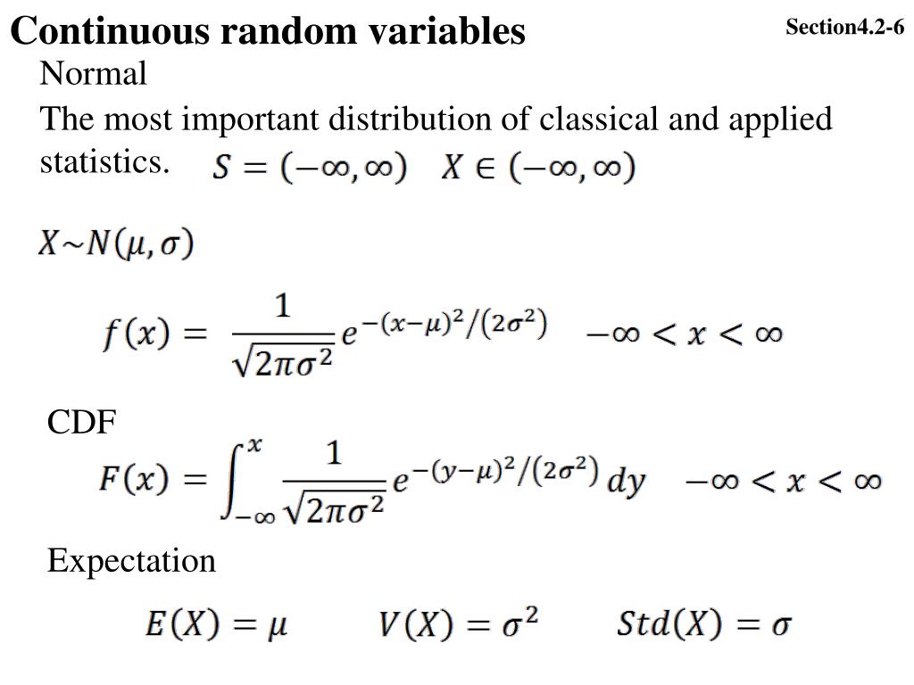 Continuous random variables Section4.2-6 Normal The most important distribution of classical and applied statistics. CDF Expectation