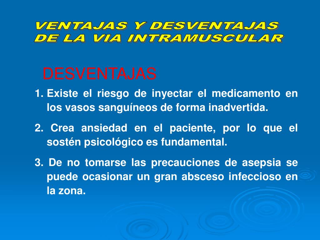 VENTAJAS Y DESVENTAJAS DE LA VIA INTRAMUSCULAR DESVENTAJAS • Existe el riesgo de inyectar el medicamento en los vasos sanguíneos de forma inadvertida. • 2. Crea ansiedad en el paciente, por lo que el sostén psicológico es fundamental. • 3. De no tomarse las precauciones de asepsia se puede ocasionar un gran absceso infeccioso en la zona.