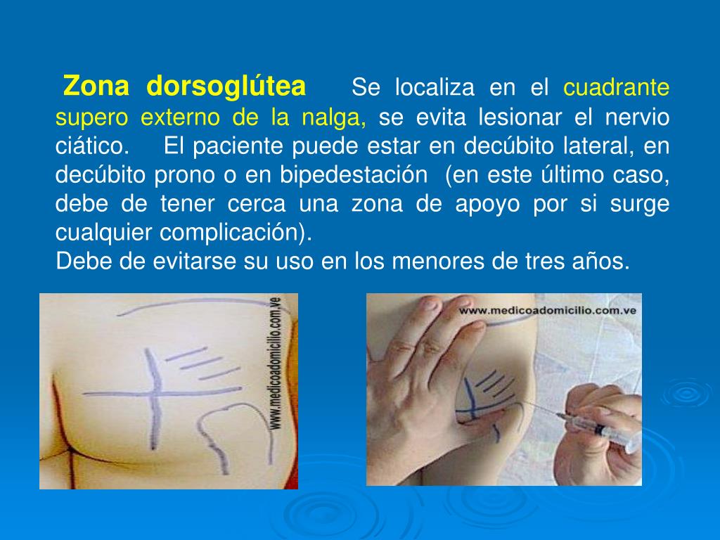 Zona dorsoglútea Se localiza en el cuadrante supero externo de la nalga, se evita lesionar el nervio ciático. El paciente puede estar en decúbito lateral, en decúbito prono o en bipedestación (en este último caso, debe de tener cerca una zona de apoyo por si surge cualquier complicación). Debe de evitarse su uso en los menores de tres años.