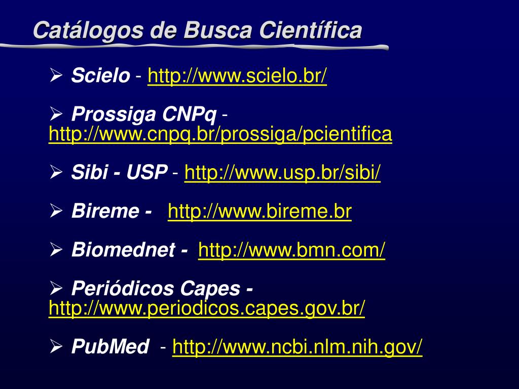 METODOLOGIA DA PESQUISA CIENTIFICA. Prof. M. Sc. Giovanni Novaes. Scielo - http://www.scielo.br/ Prossiga CNPq - http://www.cnpq.br/prossiga/pcientifica Sibi - USP - http://www.usp.br/sibi/ Bireme - http://www.bireme.br Biomednet - http://www.bmn.com/ Periódicos Capes -
