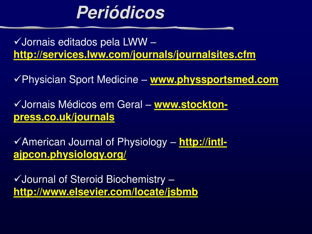 Periódicos • Jornais editados pela LWW – http://services.lww.com/journals/journalsites.cfm • Physician Sport Medicine – www.physsportsmed.com • Jornais Médicos em Geral – www.stockton-press.co.uk/journals • American Journal of Physiology –http://intl-ajpcon.physiology.org/ • Journal of Steroid Biochemistry – http://www.elsevier.com/locate/jsbmb