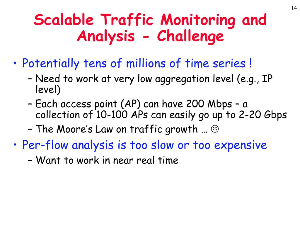 Scalable Traffic Monitoring and Analysis - Challenge • Potentially tens of millions of time series ! • Need to work at very low aggregation level (e.g., IP level) • Each access point (AP) can have 200 Mbps – a collection of 10-100 APs can easily go up to 2-20 Gbps • The Moore’s Law on traffic growth … • Per-flow analysis is too slow or too expensive • Want to work in near real time