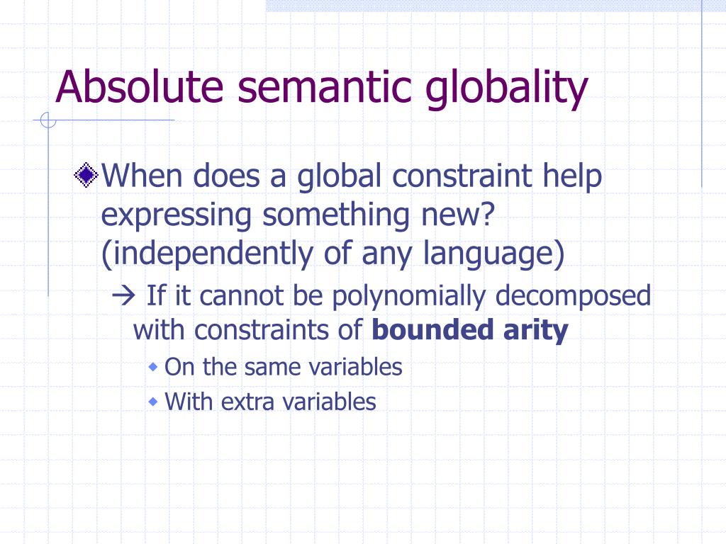 Absolute semantic globality • When does a global constraint help expressing something new? (independently of any language) If it cannot be polynomially decomposed with constraints of bounded arity • On the same variables • With extra variables