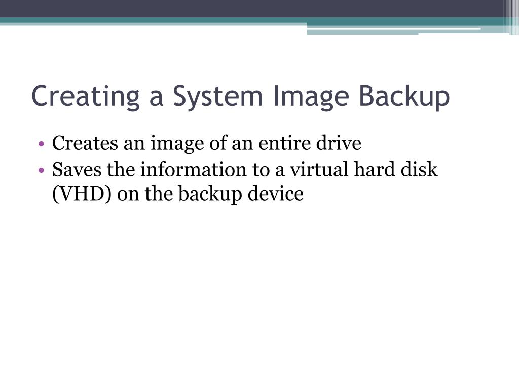Creating a System Image Backup • Creates an image of an entire drive • Saves the information to a virtual hard disk (VHD) on the backup device