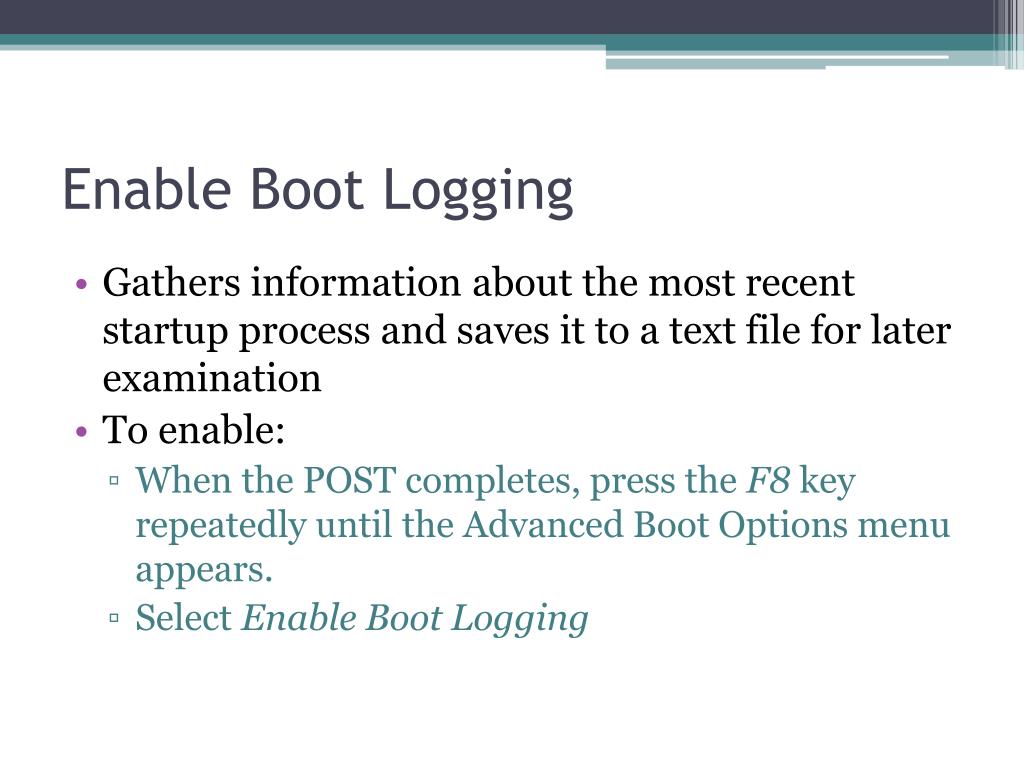 Enable Boot Logging • Gathers information about the most recent startup process and saves it to a text file for later examination • To enable: • When the POST completes, press the F8 key repeatedly until the Advanced Boot Options menu appears. • Select Enable Boot Logging