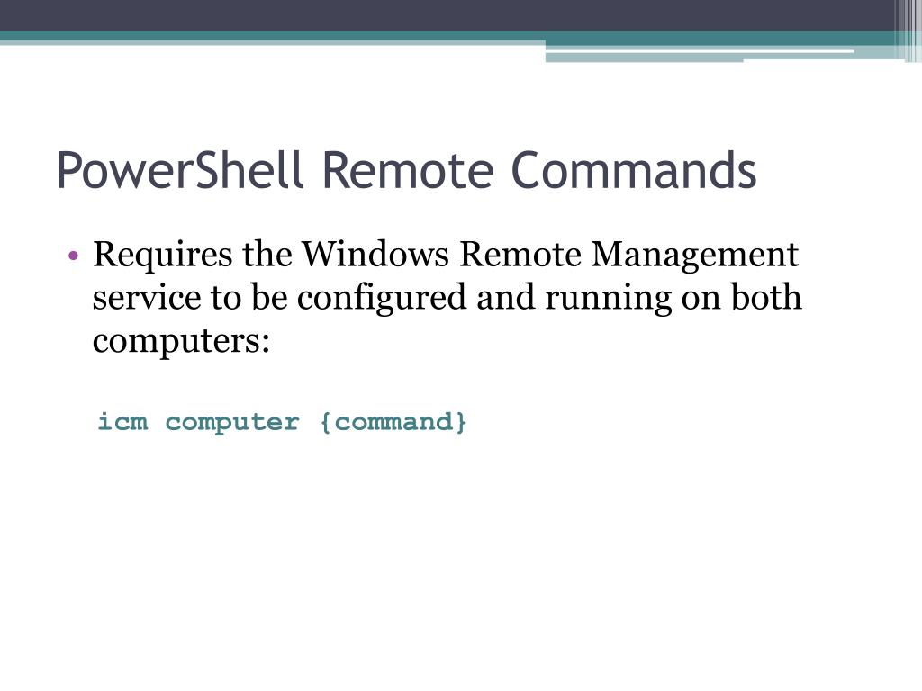 PowerShell Remote Commands • Requires the Windows Remote Management service to be configured and running on both computers: icm computer {command}