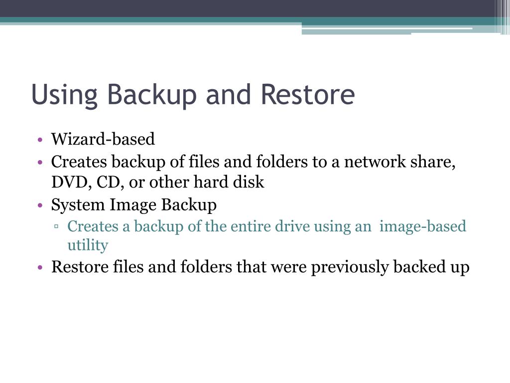 Using Backup and Restore • Wizard-based • Creates backup of files and folders to a network share, DVD, CD, or other hard disk • System Image Backup • Creates a backup of the entire drive using an image-based utility • Restore files and folders that were previously backed up