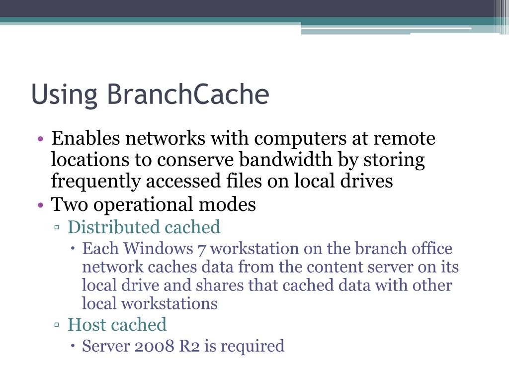 Using BranchCache • Enables networks with computers at remote locations to conserve bandwidth by storing frequently accessed files on local drives • Two operational modes • Distributed cached • Each Windows 7 workstation on the branch office network caches data from the content server on its local drive and shares that cached data with other local workstations • Host cached • Server 2008 R2 is required