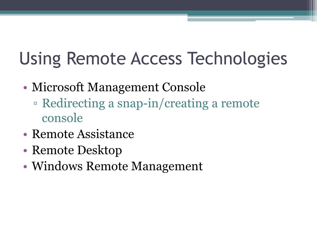 Using Remote Access Technologies • Microsoft Management Console • Redirecting a snap-in/creating a remote console • Remote Assistance • Remote Desktop • Windows Remote Management