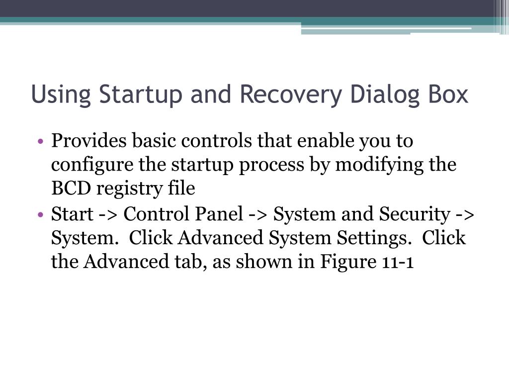 Using Startup and Recovery Dialog Box • Provides basic controls that enable you to configure the startup process by modifying the BCD registry file • Start -> Control Panel -> System and Security -> System. Click Advanced System Settings. Click the Advanced tab, as shown in Figure 11-1