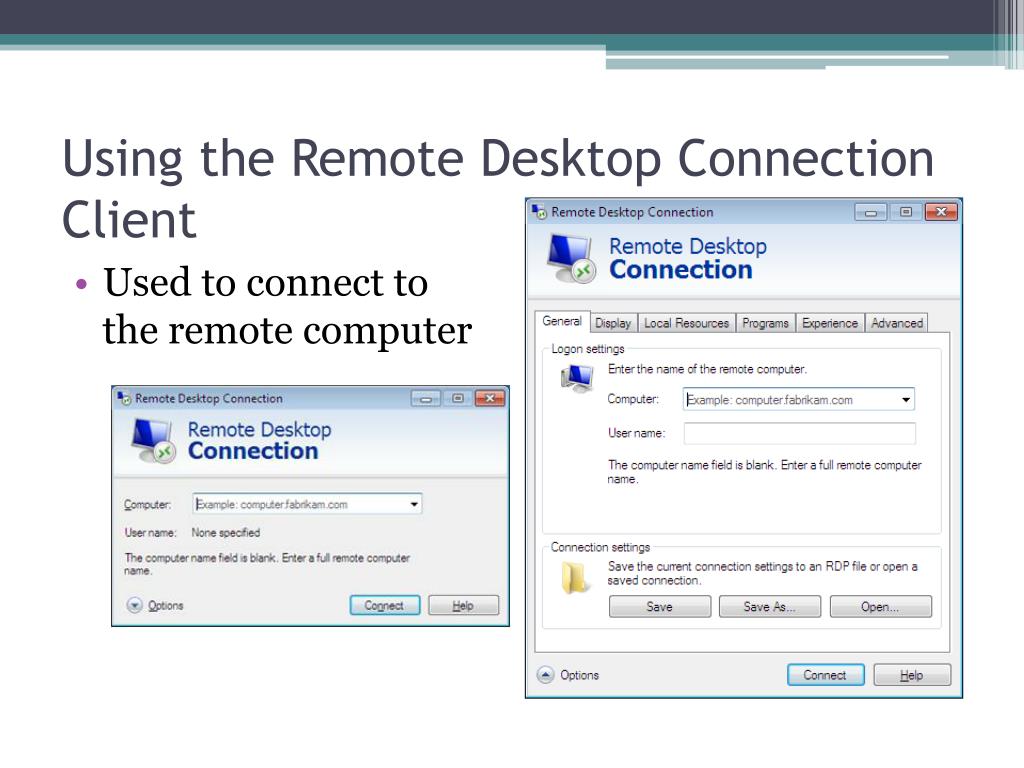 Using the Remote Desktop Connection Client • Used to connect tothe remote computer