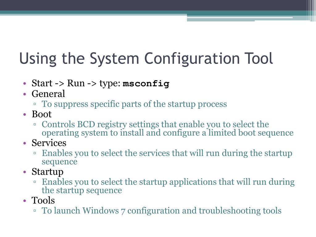 Using the System Configuration Tool • Start -> Run -> type: msconfig • General • To suppress specific parts of the startup process • Boot • Controls BCD registry settings that enable you to select the operating system to install and configure a limited boot sequence • Services • Enables you to select the services that will run during the startup sequence • Startup • Enables you to select the startup applications that will run during the startup sequence • Tools • To launch Windows 7 configuration and troubleshooting tools