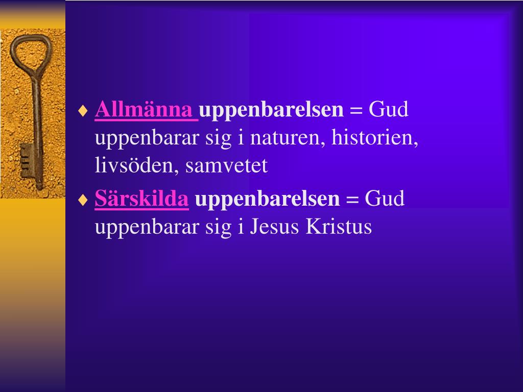 Allmänna uppenbarelsen = Gud uppenbarar sig i naturen, historien, livsöden, samvetet • Särskilda uppenbarelsen = Gud uppenbarar sig i Jesus Kristus