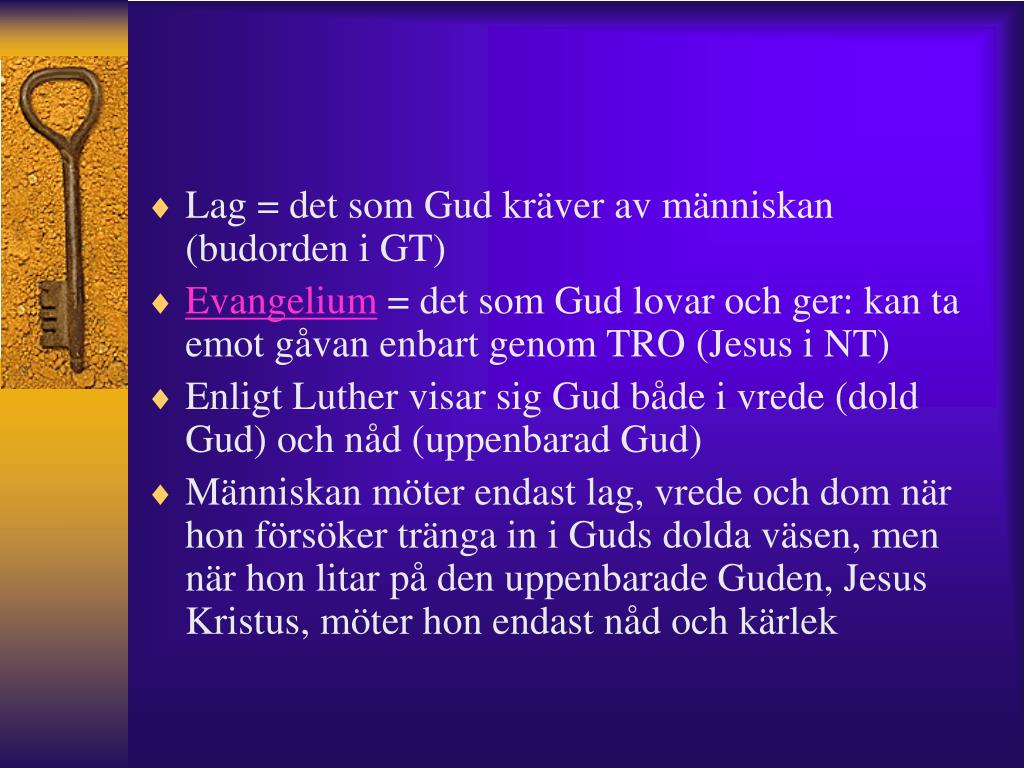 Lag = det som Gud kräver av människan (budorden i GT) • Evangelium = det som Gud lovar och ger: kan ta emot gåvan enbart genom TRO (Jesus i NT) • Enligt Luther visar sig Gud både i vrede (dold Gud) och nåd (uppenbarad Gud) • Människan möter endast lag, vrede och dom när hon försöker tränga in i Guds dolda väsen, men när hon litar på den uppenbarade Guden, Jesus Kristus, möter hon endast nåd och kärlek