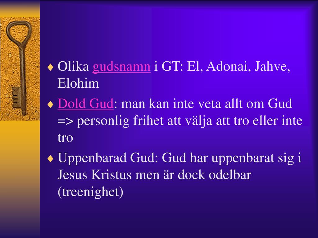 Olika gudsnamn i GT: El, Adonai, Jahve, Elohim • Dold Gud: man kan inte veta allt om Gud => personlig frihet att välja att tro eller inte tro • Uppenbarad Gud: Gud har uppenbarat sig i Jesus Kristus men är dock odelbar (treenighet)