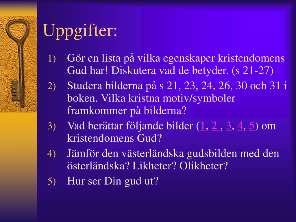 Uppgifter: • Gör en lista på vilka egenskaper kristendomens Gud har! Diskutera vad de betyder. (s 21-27) • Studera bilderna på s 21, 23, 24, 26, 30 och 31 i boken. Vilka kristna motiv/symboler framkommer på bilderna? • Vad berättar följande bilder (1, 2 , 3, 4, 5) om kristendomens Gud? • Jämför den västerländska gudsbilden med den österländska? Likheter? Olikheter? • Hur ser Din gud ut?