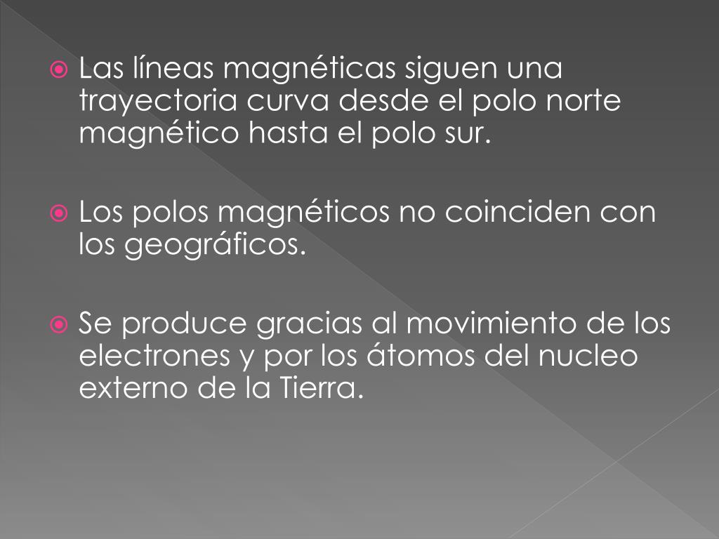 Las líneas magnéticas siguen una trayectoria curva desde el polo norte magnético hasta el polo sur. • Los polos magnéticos no coinciden con los geográficos. • Se produce gracias al movimiento de los electrones y por los átomos del nucleo externo de la Tierra.