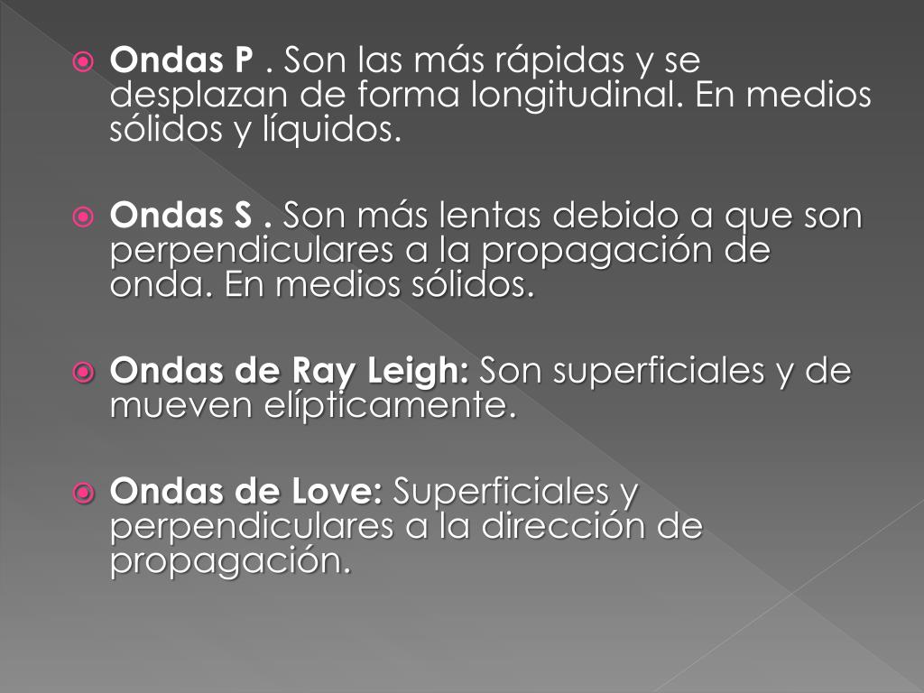 Ondas P . Son las más rápidas y se desplazan de forma longitudinal. En medios sólidos y líquidos. • Ondas S . Son más lentas debido a que son perpendiculares a la propagación de onda. En medios sólidos. • Ondas de RayLeigh: Son superficiales y de mueven elípticamente. • Ondas de Love: Superficiales y perpendiculares a la dirección de propagación.