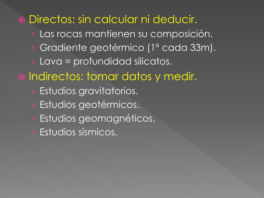 Directos: sin calcular ni deducir. • Las rocas mantienen su composición. • Gradiente geotérmico (1º cada 33m). • Lava = profundidad silicatos. • Indirectos: tomar datos y medir. • Estudios gravitatorios. • Estudios geotérmicos. • Estudios geomagnéticos. • Estudios sísmicos.