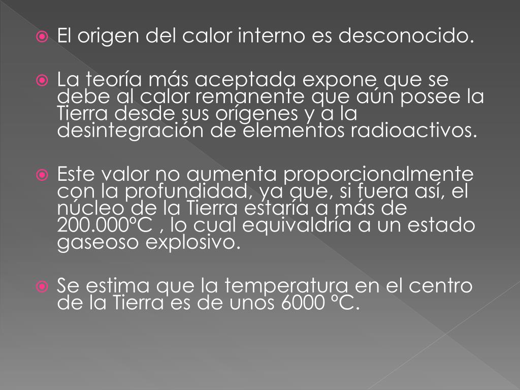El origen del calor interno es desconocido. • La teoría más aceptada expone que se debe al calor remanente que aún posee la Tierra desde sus orígenes y a la desintegración de elementos radioactivos. • Este valor no aumenta proporcionalmente con la profundidad, ya que, si fuera así, el núcleo de la Tierra estaría a más de 200.000ºC , lo cual equivaldría a un estado gaseoso explosivo. • Se estima que la temperatura en el centro de la Tierra es de unos 6000 ºC.