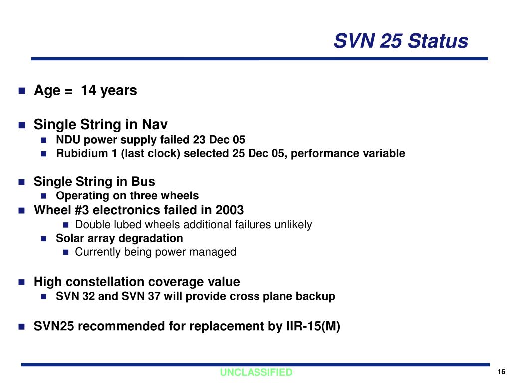SVN 25 Status • Age = 14 years • Single String in Nav • NDU power supply failed 23 Dec 05 • Rubidium 1 (last clock) selected 25 Dec 05, performance variable • Single String in Bus • Operating on three wheels • Wheel #3 electronics failed in 2003 • Double lubed wheels additional failures unlikely • Solar array degradation • Currently being power managed • High constellation coverage value • SVN 32 and SVN 37 will provide cross plane backup • SVN25 recommended for replacement by IIR-15(M)
