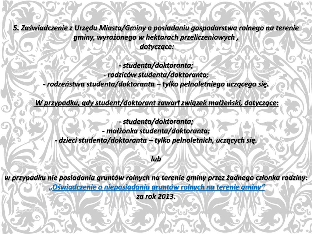 5. Zaświadczenie z Urzędu Miasta/Gminy o posiadaniu gospodarstwa rolnego na terenie gminy, wyrażonego w hektarach przeliczeniowych , dotyczące:- studenta/doktoranta;- rodziców studenta/doktoranta;- rodzeństwa studenta/doktoranta – tylko pełnoletniego uczącego się. W przypadku, gdy student/doktorant zawarł związek małżeński, dotyczące: - studenta/doktoranta;- małżonka studenta/doktoranta;- dzieci studenta/doktoranta – tylko pełnoletnich, uczących się. lubw przypadku nie posiadania gruntów rolnych na terenie gminy przez żadnego członka rodziny: „Oświadczenie o nieposiadaniu gruntów rolnych na terenie gminy”za rok 2013.