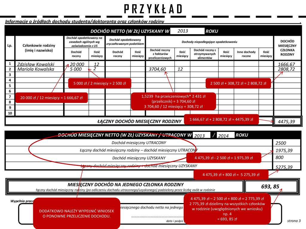 Strona 3 Rok poprzedni tj. 2013. Ilość miesięcy, w których uzyskano dochód w 2013 roku. Dochód uzyskany przez cały rok 2013 z działalności gospodarczej. 12 miesięcy. Ilość miesięcy, w których uzyskano inne dochody. Dochód uzyskany przez cały rok 2013 z gruntów rolnych(liczba hektarów razy 2431 zł). Ilość miesięcy, w których otrzymywano alimenty. Dochód uzyskany przez cały rok 2013 np. z pracy, zasiłku itp. POMNIEJSZONY O SKŁADKI SPOŁECZNE, PODATEK i SKŁADKI ZDROWOTNE. Dochód roczny podzielony przez ilość miesięcy, w których został uzyskany. Imię i Nazwisko wszystkich członków rodziny, którzy uzyskali dochód w 2013 roku. Ilość miesięcy, w których uzyskano dochód w 2013 roku z działalności. Inne dochody roczne . Dochód uzyskany przez cały rok 2013 z otrzymywanych alimentów. Łączna suma dochodów miesięcznych wszystkich członków rodziny. 2013/2014. DOCHÓD UTRACONY I UZYSKANY NALEŻY WPISAC W MOMENCIE GDY KTÓRYŚ Z CZŁONKÓW STRACIŁ DOCHODY Z 2013 ROKU LUB UZYSKAŁ NOWE W 2014 ROKU Dochód miesięczny, który został utracony w 2013 roku. Łączny dochód miesięczny rodziny, pomniejszony o dochód miesięczny utracony. Dochód miesięczny, który został uzyskany w 2014 roku. Łączny dochód miesięczny rodziny, powiększony o dochód miesięczny uzyskany. Łączny dochód miesięczny rodziny (pomniejszony o dochód miesięczny utracony i powiększony o dochód miesięczny uzyskany) podzielony przez liczbę członków. Wypełnia pracownik WSSiD
