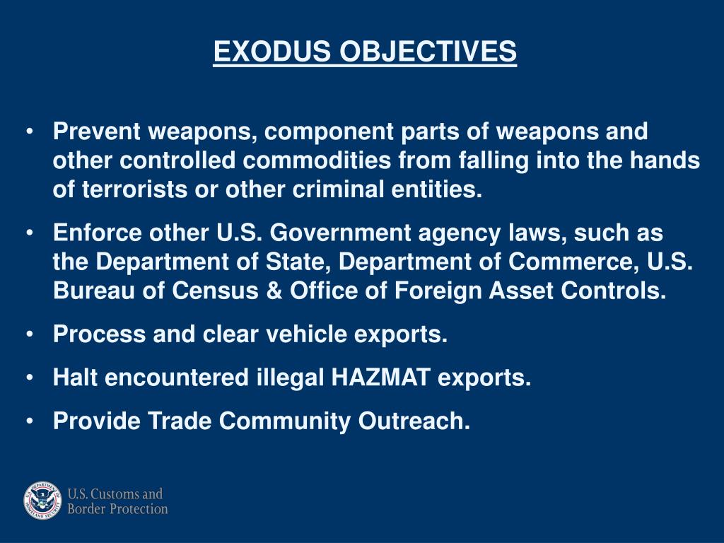 EXODUS OBJECTIVES • Prevent weapons, component parts of weapons and other controlled commodities from falling into the hands of terrorists or other criminal entities. • Enforce other U.S. Government agency laws, such as the Department of State, Department of Commerce, U.S. Bureau of Census & Office of Foreign Asset Controls. • Process and clear vehicle exports. • Halt encountered illegal HAZMAT exports. • Provide Trade Community Outreach.