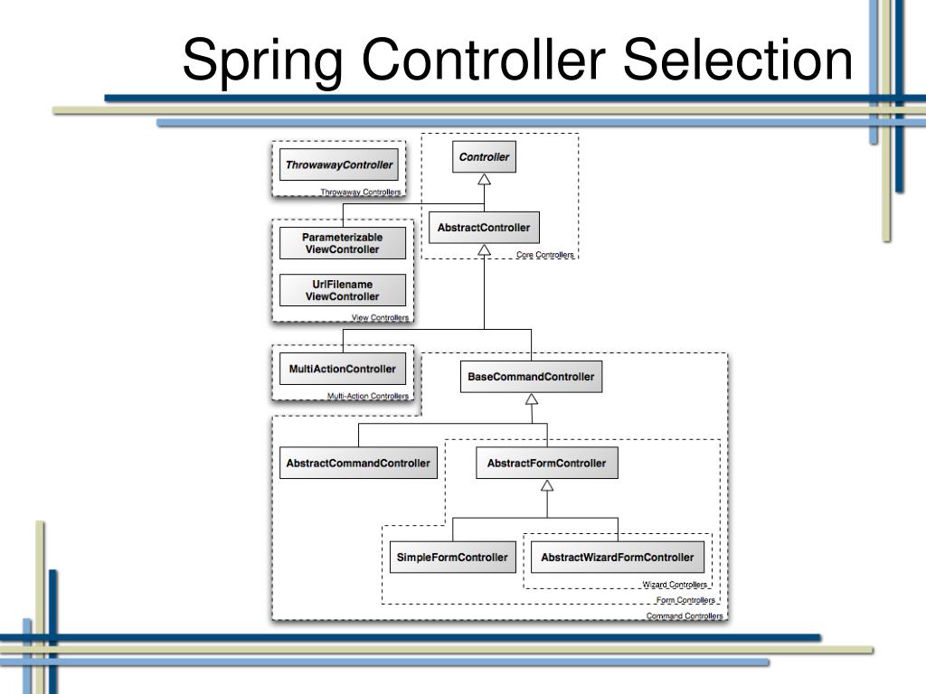 Mapping URLs to controllers • SimpleUrlHandlerMapping: <bean id="urlMapping" class="org.springframework.web.servlet.handler. SimpleUrlHandlerMapping"> <property name="mappings"> <value> /home.htm=homeController /login.htm=loginController /addSpittle.htm=addSpittleController /addSpitter.htm=addSpitterController </value> </property> </bean>