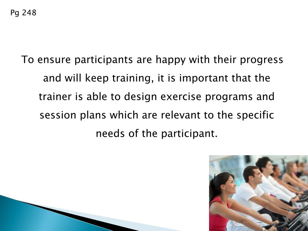 Pg 248 To ensure participants are happy with their progress and will keep training, it is important that the trainer is able to design exercise programs and session plans which are relevant to the specific needs of the participant.