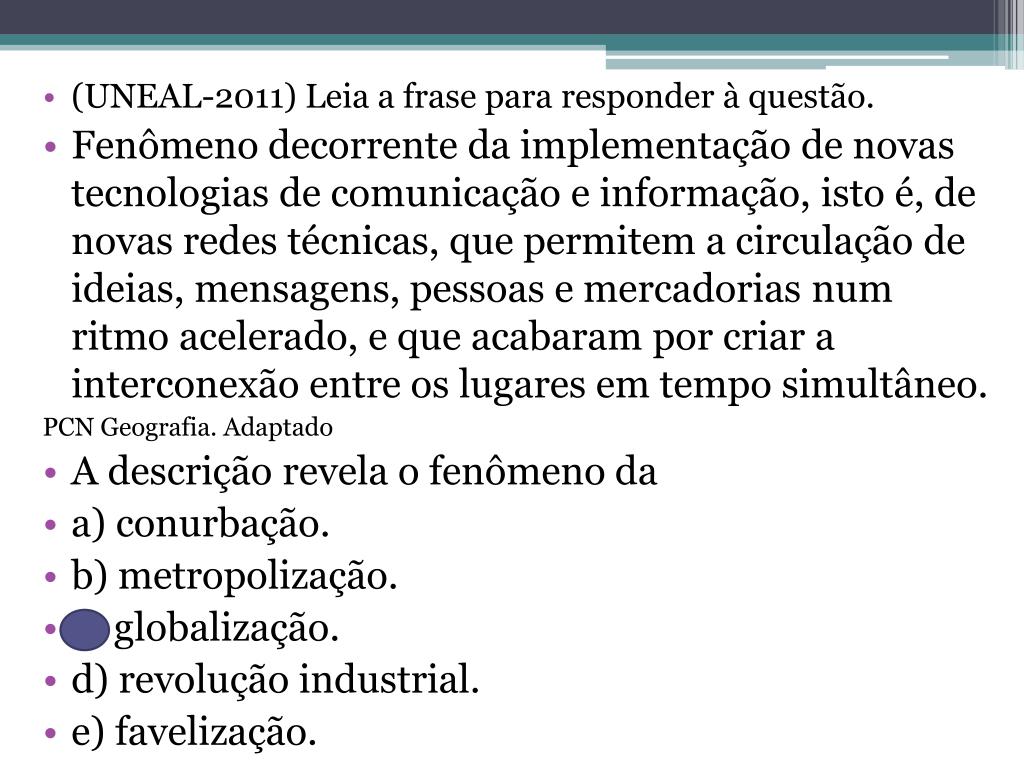 (UNEAL-2011) Leia a frase para responder à questão. • Fenômeno decorrente da implementação de novas tecnologias de comunicação e informação, isto é, de novas redes técnicas, que permitem a circulação de ideias, mensagens, pessoas e mercadorias num ritmo acelerado, e que acabaram por criar a interconexão entre os lugares em tempo simultâneo. PCN Geografia. Adaptado • A descrição revela o fenômeno da • a) conurbação. • b) metropolização. • c) globalização. • d) revolução industrial. • e) favelização.