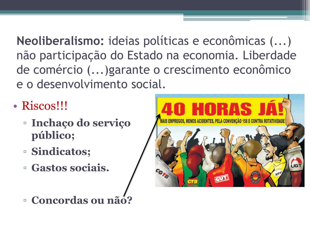 Neoliberalismo: ideias políticas e econômicas (...) não participação do Estado na economia. Liberdade de comércio (...)garante o crescimento econômico e o desenvolvimento social. • Riscos!!! • Inchaço do serviço público; • Sindicatos; • Gastos sociais. • Concordas ou não?