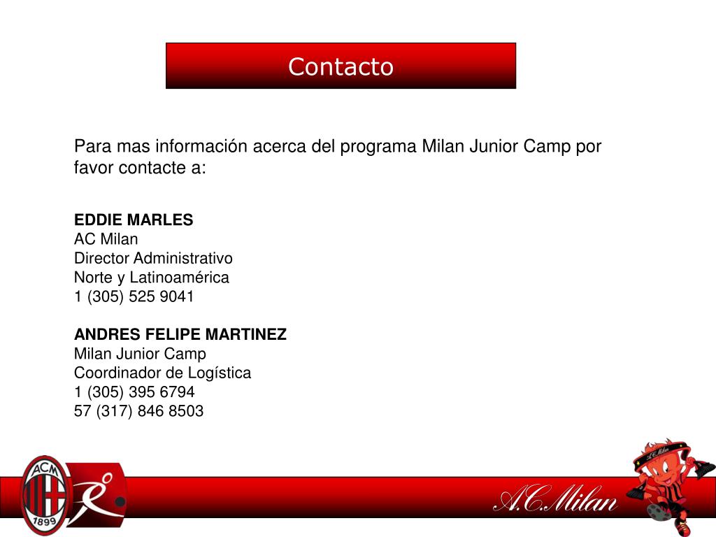 Contacto Para mas información acerca del programa Milan Junior Camp por favor contacte a: EDDIE MARLES AC Milan Director Administrativo Norte y Latinoamérica 1 (305) 525 9041 ANDRES FELIPE MARTINEZ Milan Junior Camp Coordinador de Logística 1 (305) 395 6794 57 (317) 846 8503