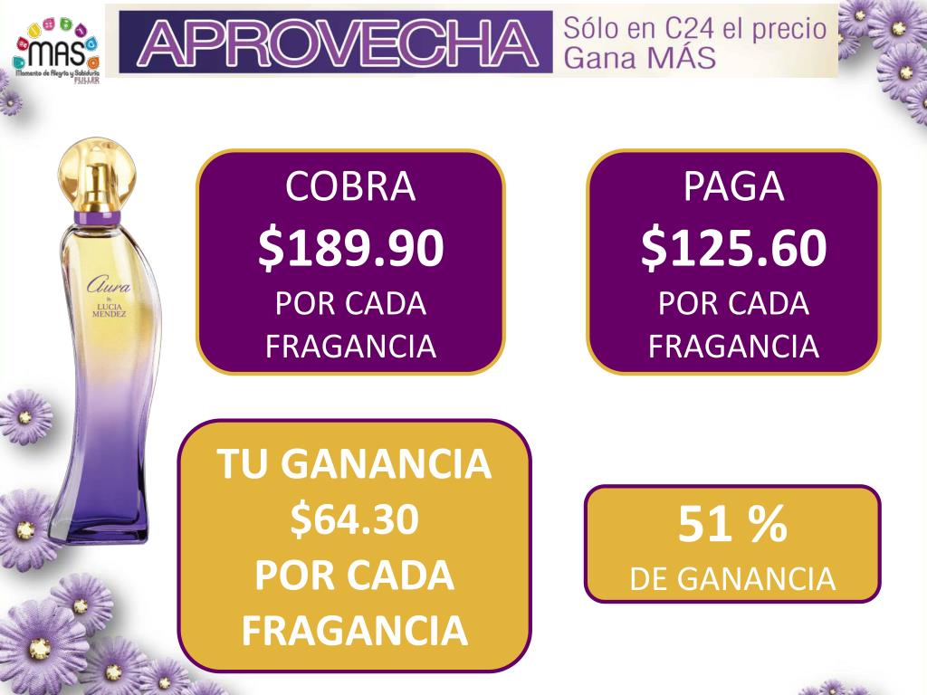 COBRA $189.90 POR CADA FRAGANCIA PAGA $125.60 POR CADA FRAGANCIA TU GANANCIA $64.30 POR CADA FRAGANCIA 51 % DE GANANCIA
