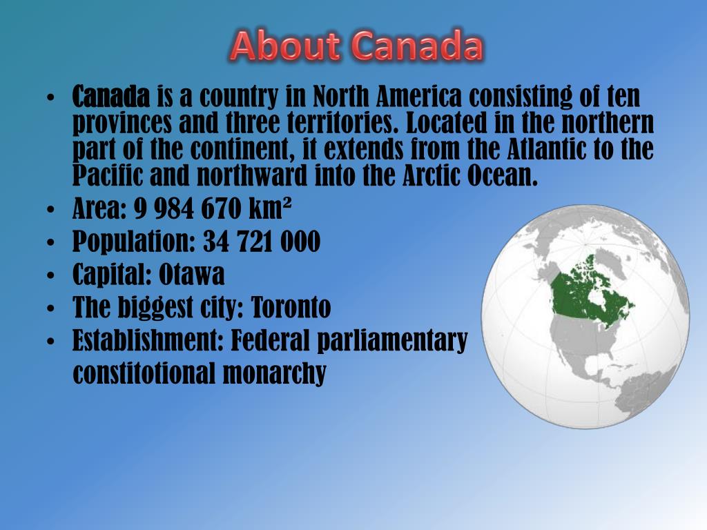 About Canada • Canada is a country in North America consisting of ten provinces and three territories. Located in the northern part of the continent, it extends from the Atlantic to the Pacific and northward into the Arctic Ocean. • Area: 9 984 670 km² • Population: 34 721 000 • Capital: Otawa • The biggest city: Toronto • Establishment: Federal parliamentary constitotional monarchy